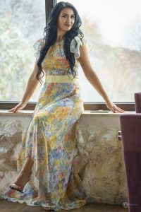 O rochie usoara, fluida perfecta pentru zile insorite dar totodata si eleganta. Croiul rochiei pune in valoare atat talia care este conturata de un brau cat si silueta picoarelor fiind mai scutra in fata si mai lunga in spate chir cu o usoara trena. Croiul deosebit si la moda va face din aparitia ta una super-feminina si de senzatie indiferent de ocazie, fie nunta, botez, banchet sau cocktail.
